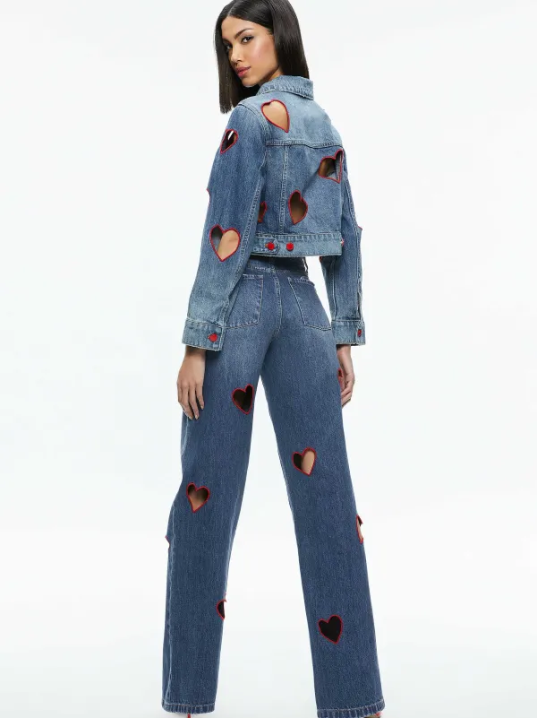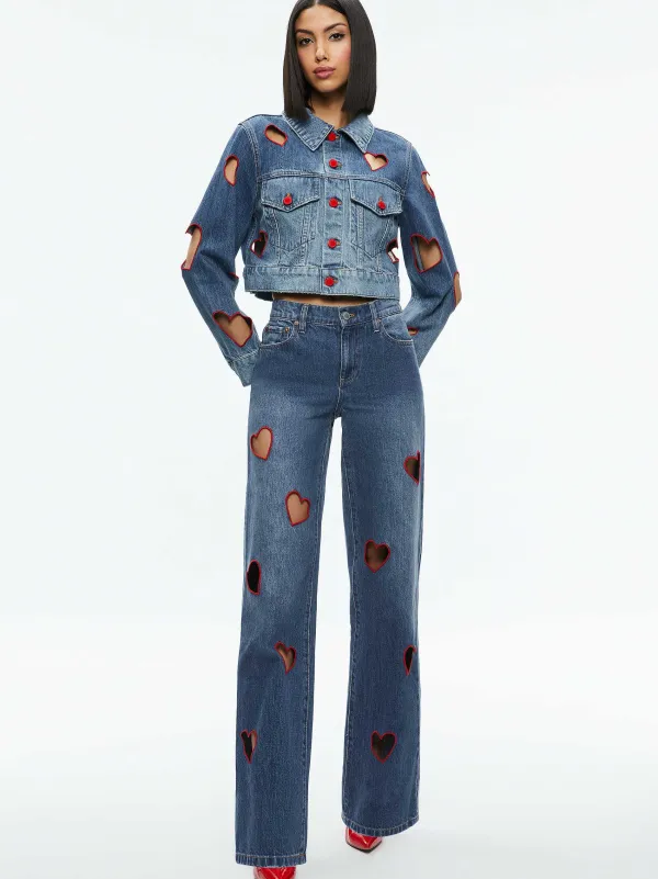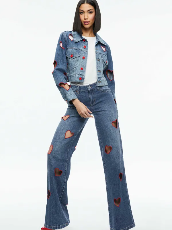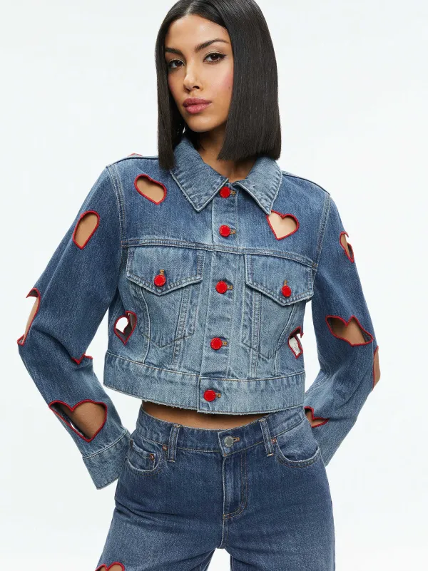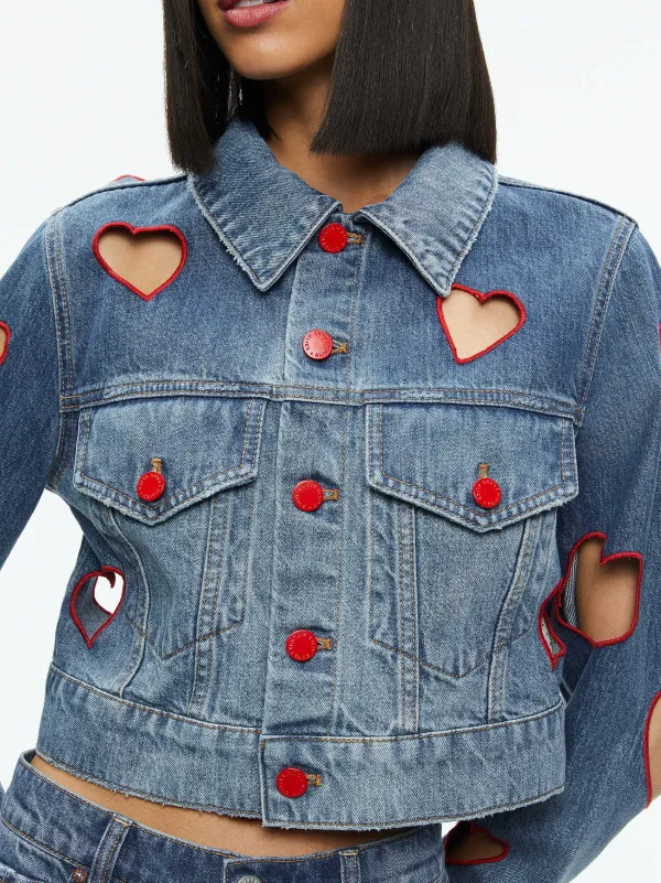 DescriptionWe Love The Attitude Of This Cropped Denim Jacket, With Its Heart-Shaped Embroidered Cut-Outs, Oversized Fit, Front Pocket Details And Mix Of Denim. Throw Over Dresses, Tees And Jeans, Bodysuits….You Name It. (Though We Are Particularly Partial To This Style Paired With, You Guessed It, More Denim.)Details- Cropped Denim Jacket
