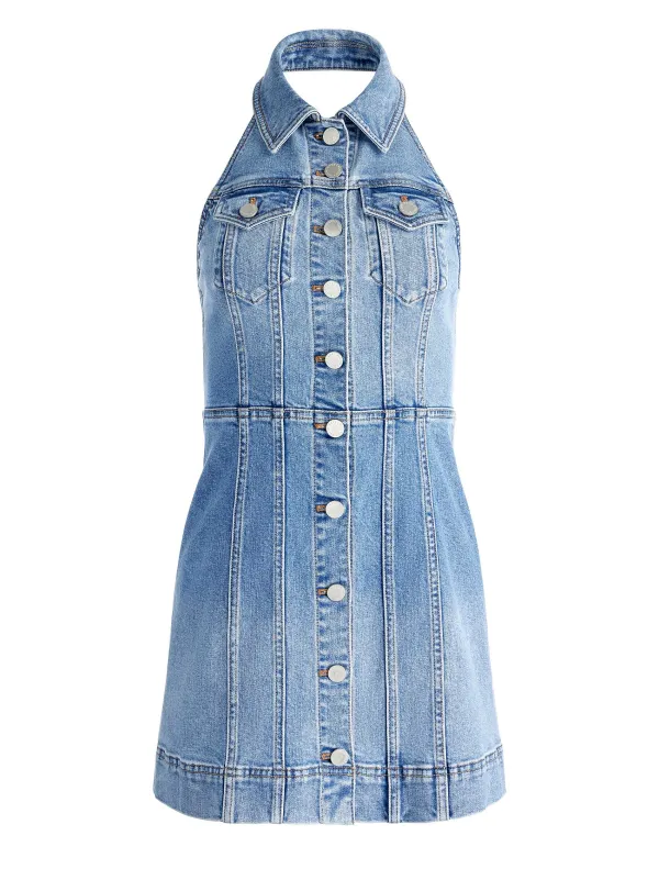 DescriptionYou’Re Looking At An Easy Denim Minidress To Keep You Cool (And Cute). This Includes A Halter Neck, Front Buttons And Collared Design That Feels Sharp.Details- Denim Mini Dress