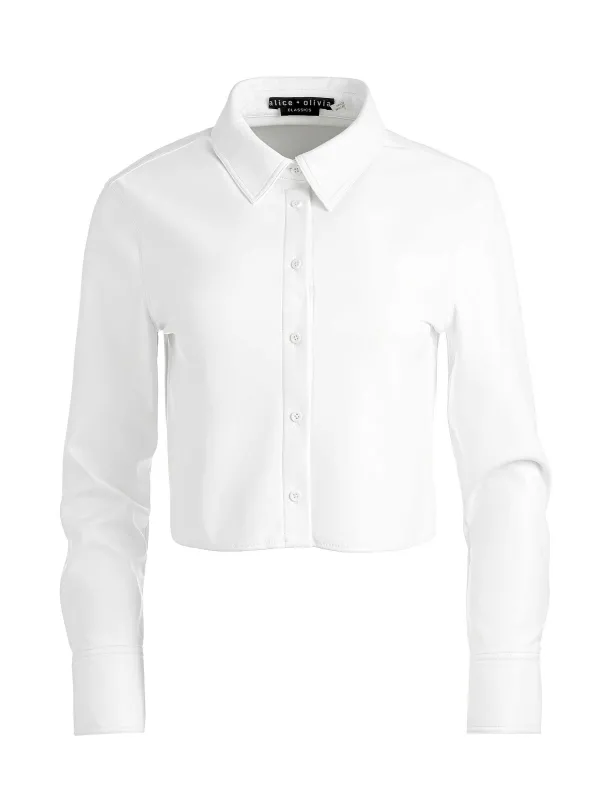 DescriptionThe Classic Button Up With An A+O Touch: Vegan Leather And Cropped Length. Throw It On With Jeans, A Skirt, Whatever. It’S A Wardrobe Staple You Will-And Should-Wear To The Ground.Details- Button Down
