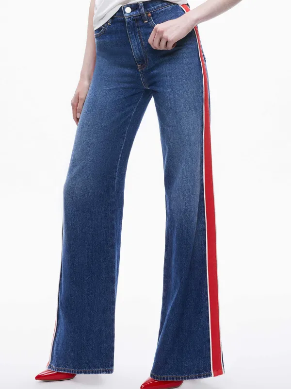 DescriptionMeet The Weezy Jean. She Has An Incredibly Flattering High Waist And Wide Leg (Not That You Need Any Help). Peep The Extra Twist, A Bold Side Stripe.Details- Wide Leg Jean